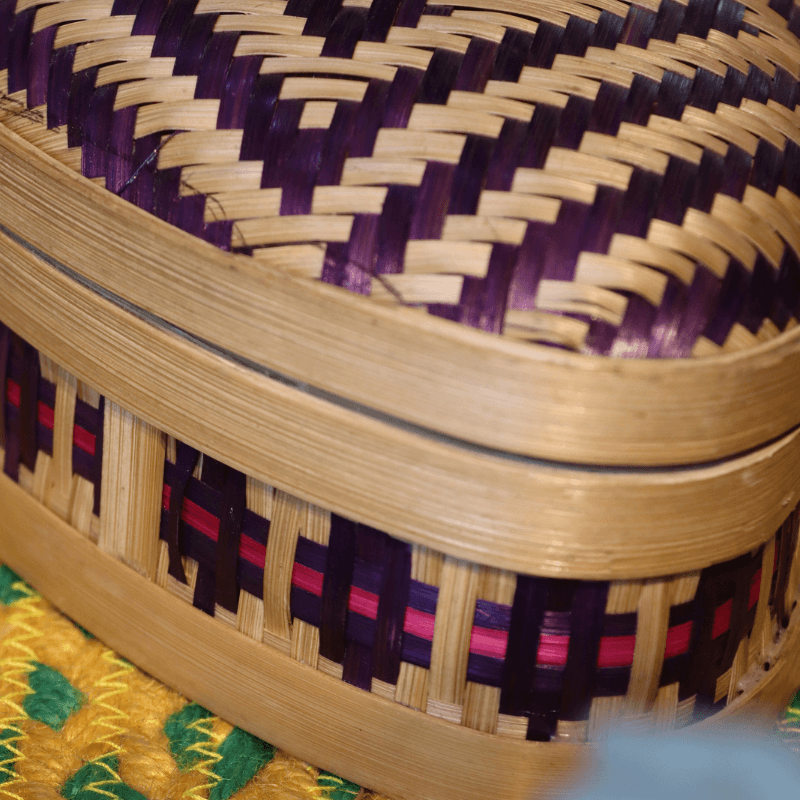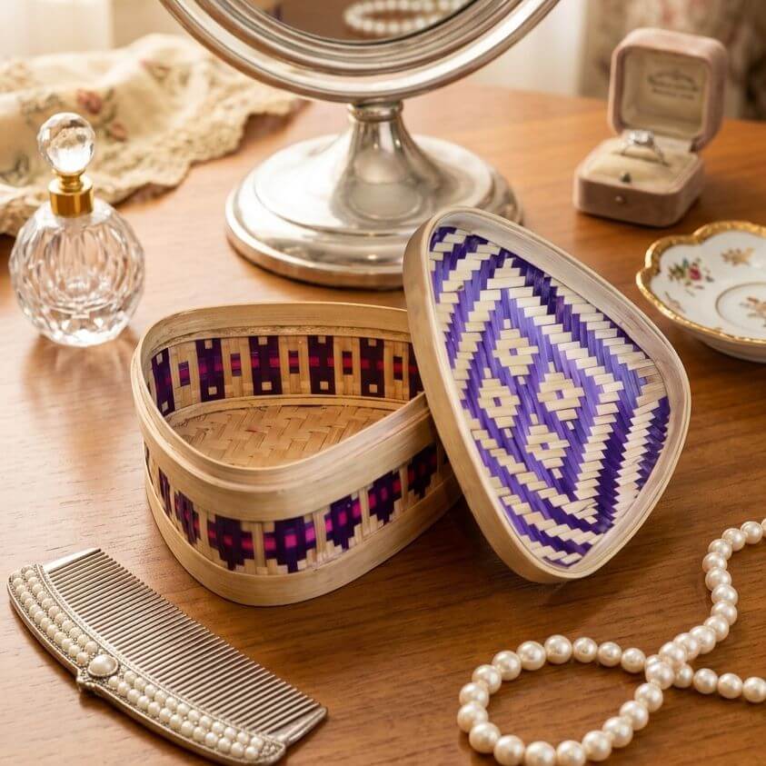This elegant bamboo box is carefully handcrafted with intricate weaving and vibrant accents, combining traditional craftsmanship with practical storage. Its smooth finish and snug lid make it perfect for organizing small items while adding a natural, decorative touch to any space.