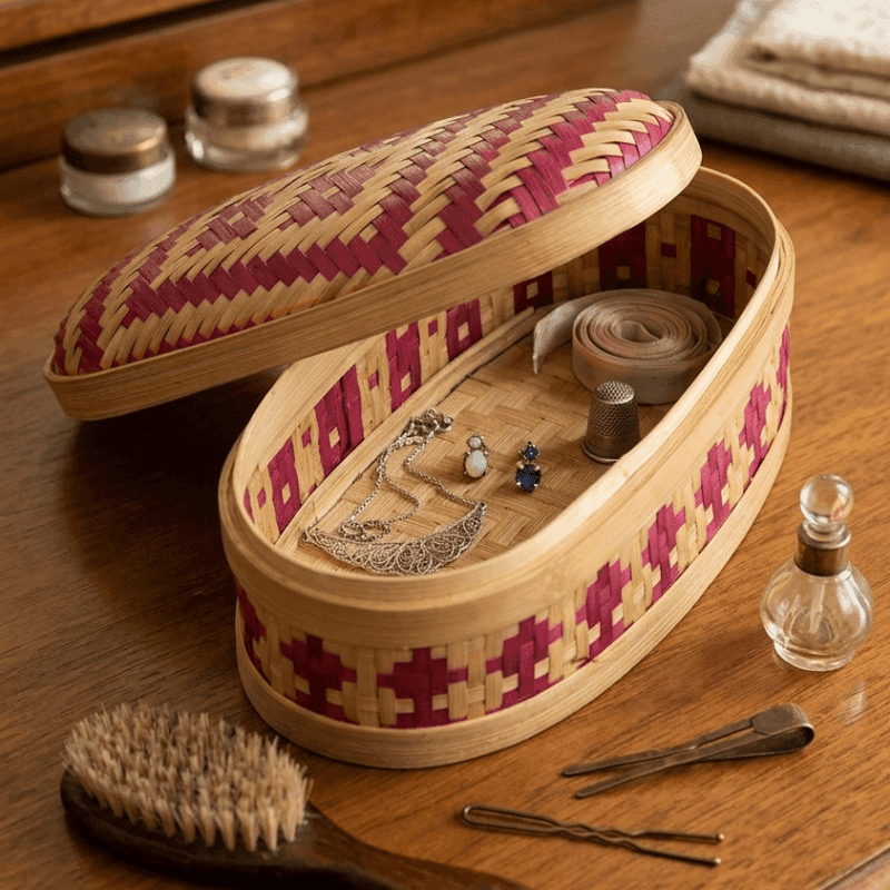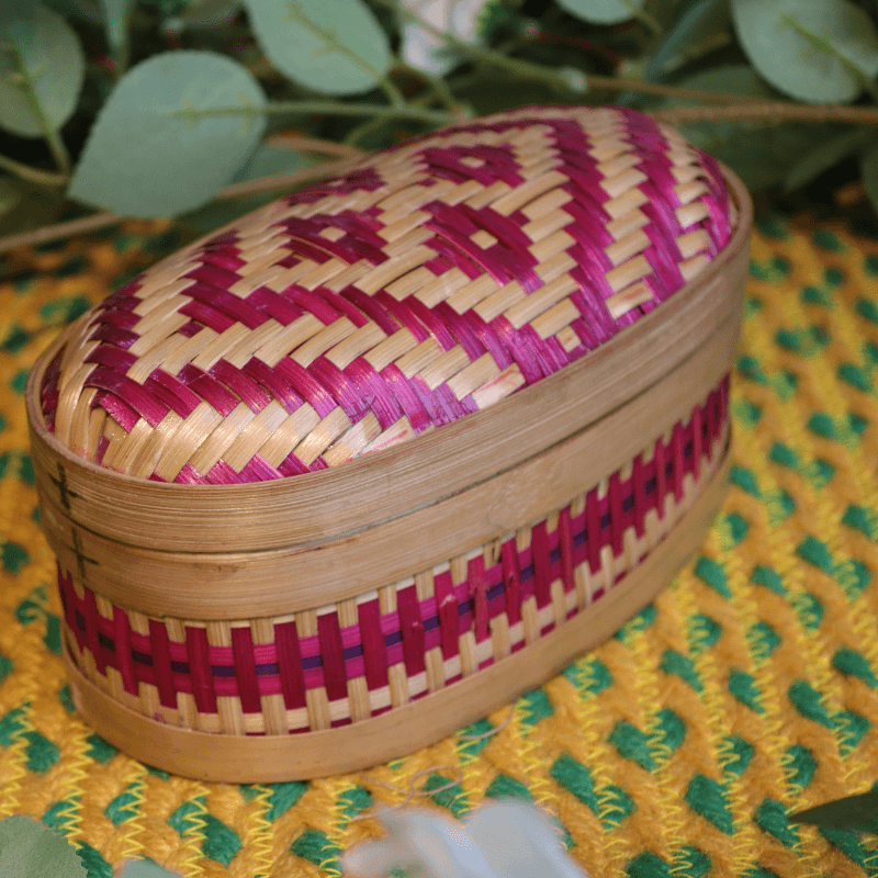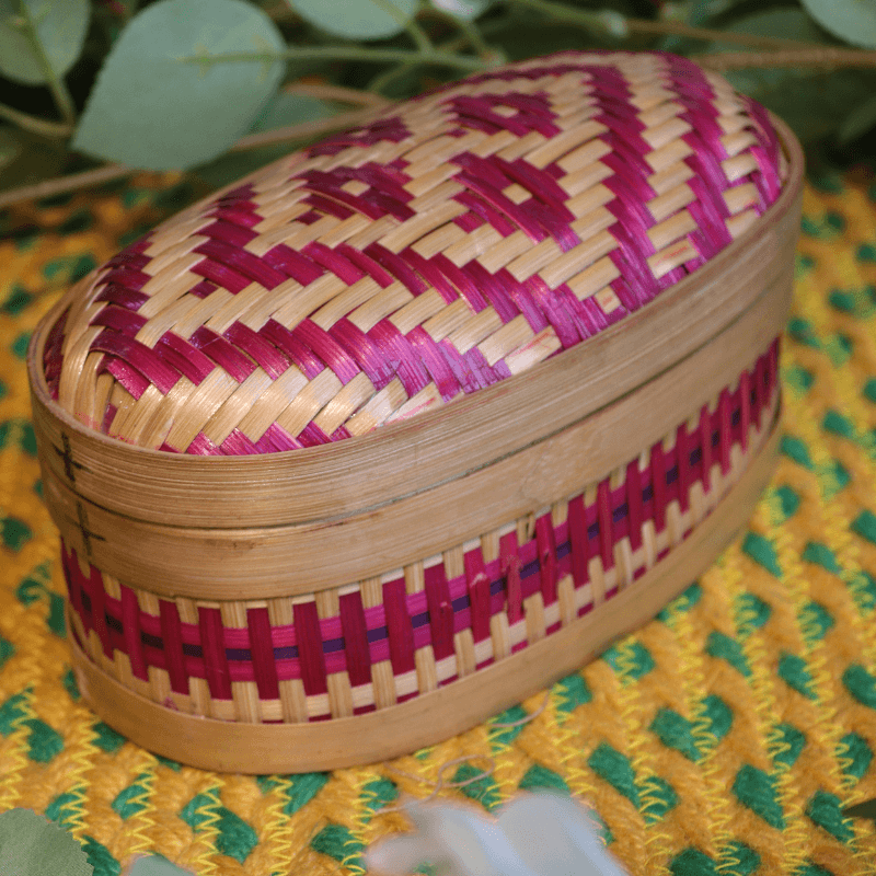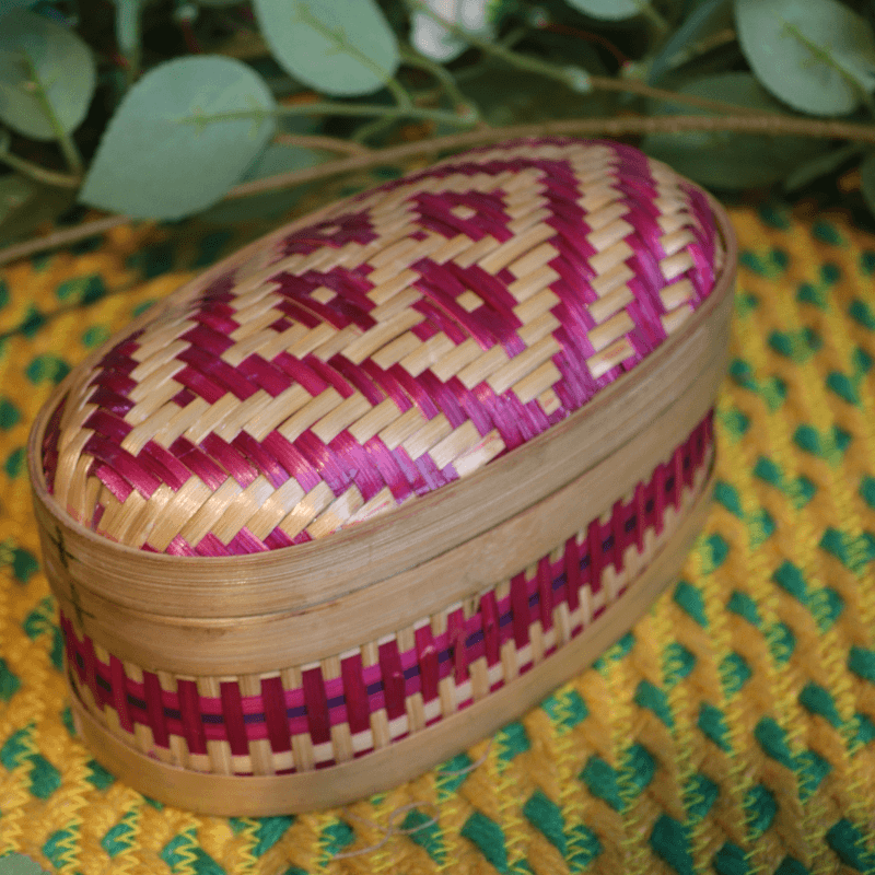 This elegant bamboo box is carefully handcrafted with intricate weaving and vibrant accents, combining traditional craftsmanship with practical storage. Its smooth finish and snug lid make it perfect for organizing small items while adding a natural, decorative touch to any space.